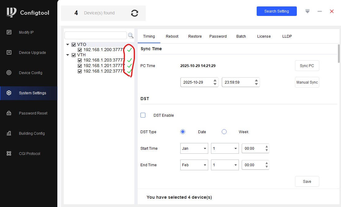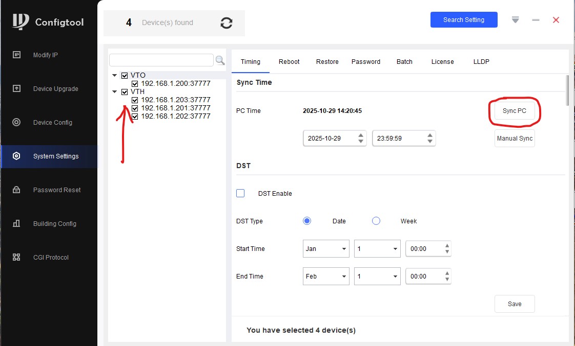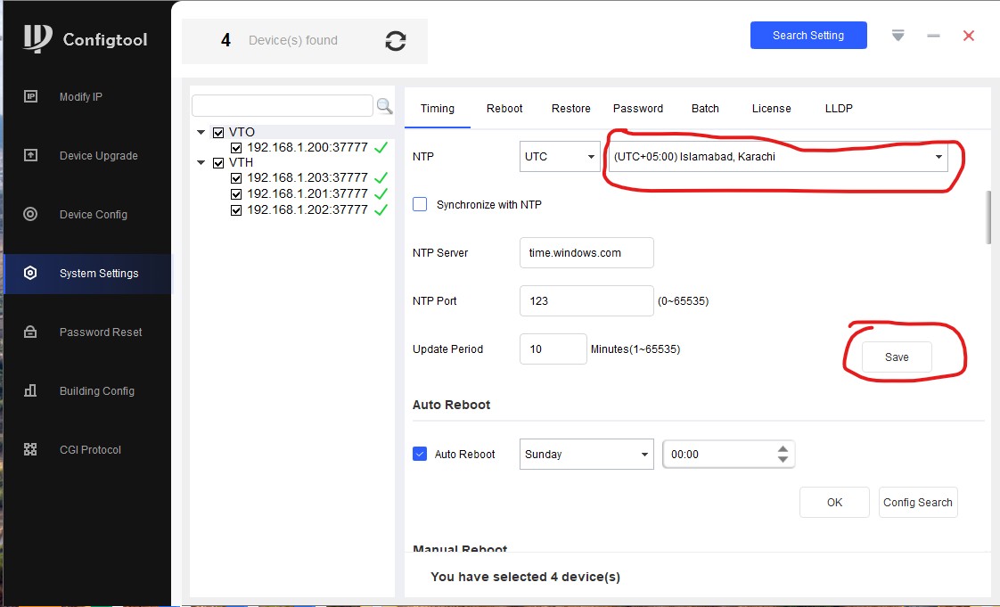 Мы выбираем все устройства слева, синхронизируем их время с временем ПК/ноута, спускаемся чуть ниже, выбираем часовой пояс, нажимаем "Save". Все, время/дата на всех устройствах корректное.