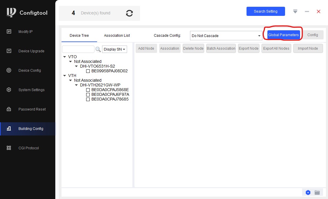 Приступаем непосредственно к конфигурации системы домофонов. Для этого идем на вкладку "Building Config". Слева мы видим список устройств, и видим что они пока не ассоциированы друг с другом. Ассоциация в данном случае - это "присвоены ли устройства к квартирам или нет". Здесь первым делом идем на вкладку "Global Parameters".
