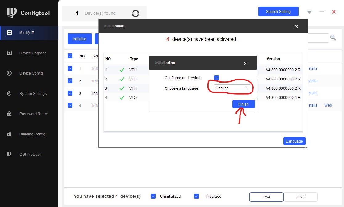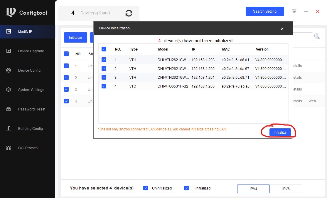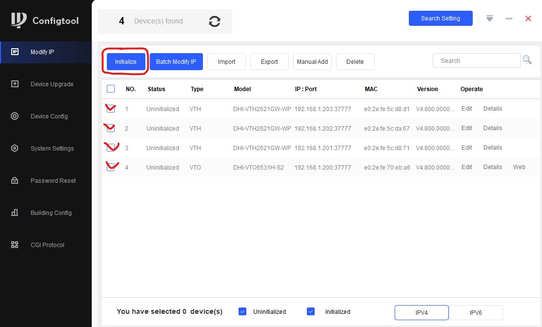 У нас есть 4 неинициализированных устройства. Ставим галочки, нажимаем кнопку "Initialize":