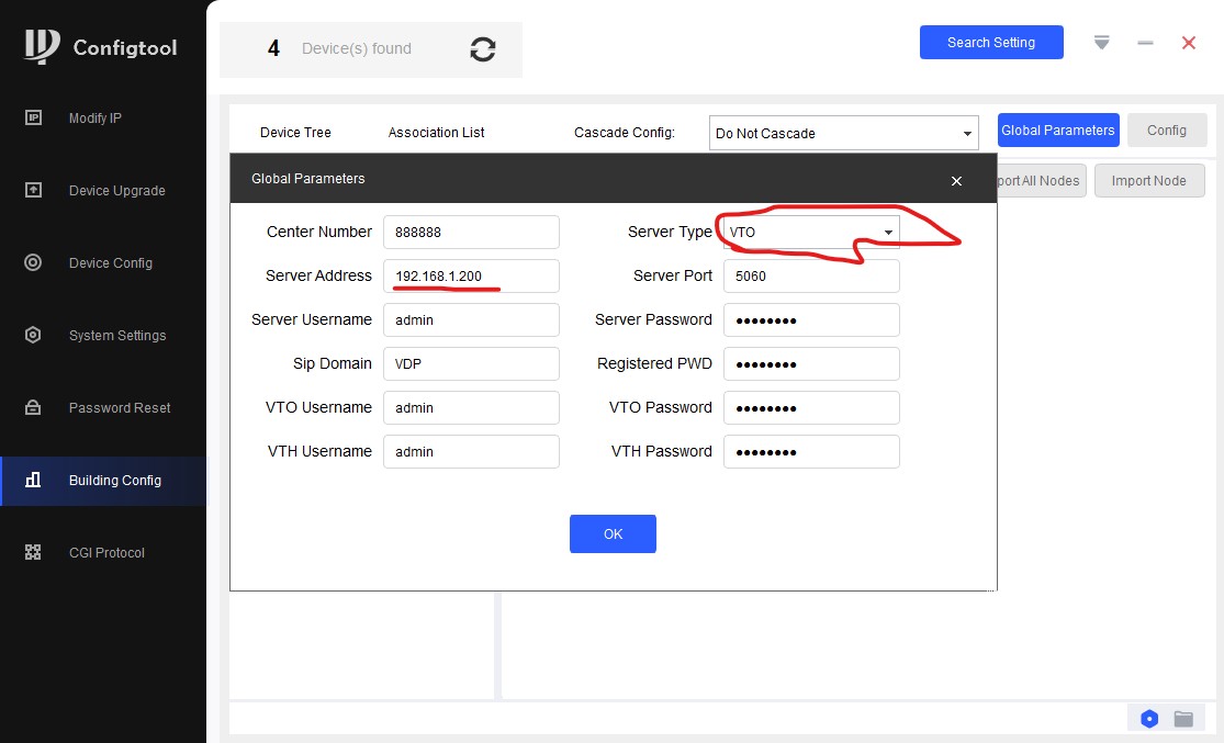 Здесь мы первым делом задаем IP адрес нашего сервера. В нашем случае сервером выступает VTO, поэтому в это поле вбиваем адрес VTO. Далее нужно выбрать тип сервера. Там также выбираем VTO. Ниже вбиваем пароли, в нашем случае мы вбили одинаковый везде.