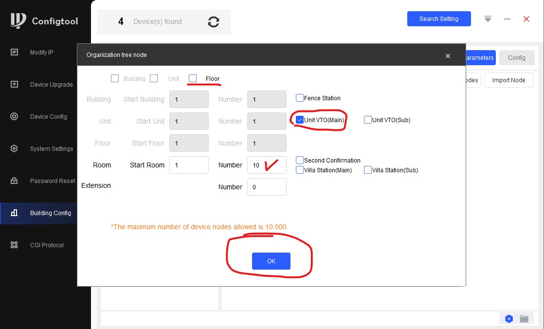 Здесь снимаем галочку с floor, выбираем "Unit VTO (Main)". Start Room - номер первой квартиры подъезда, поле напротив Number - количество квартир (в переводе "комнат", в нашем случае - квартир)