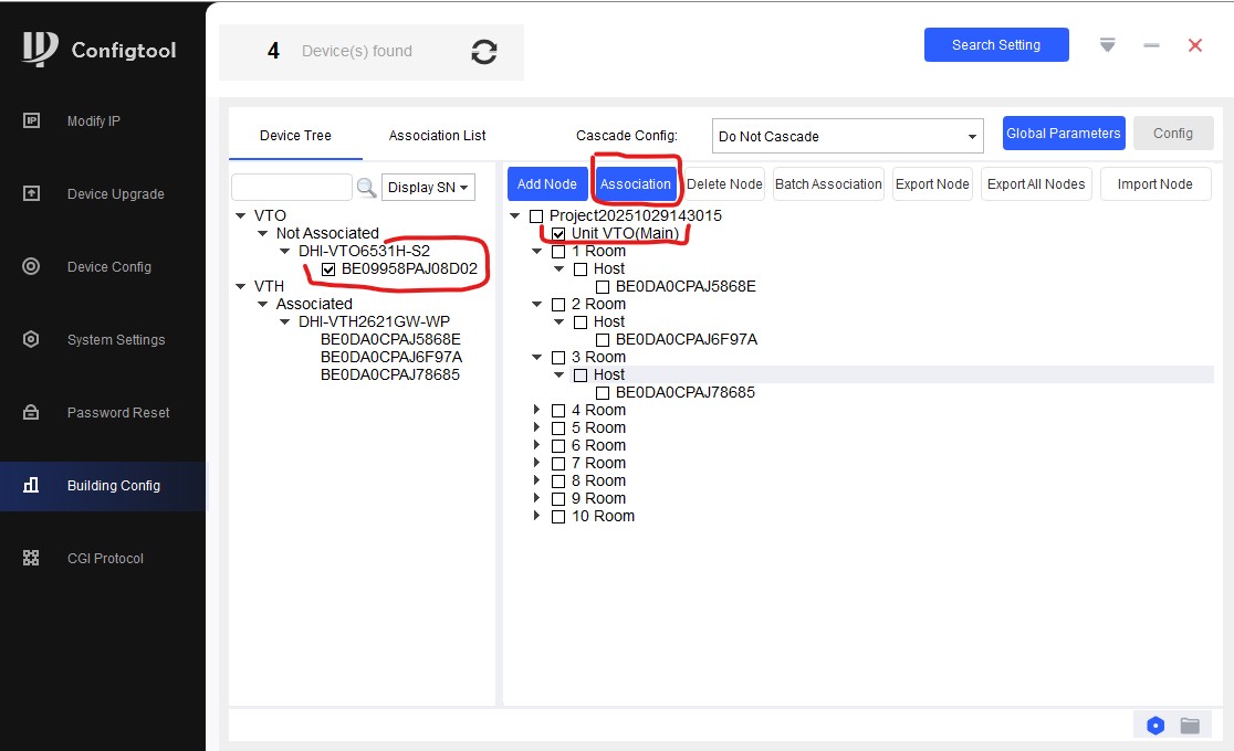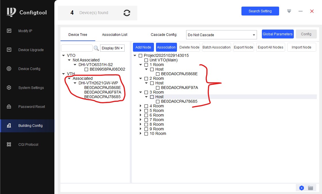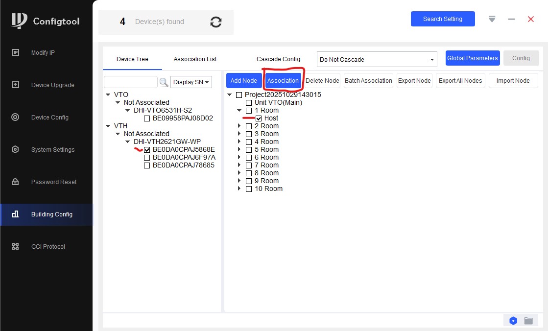 Теперь наша задача - отметить галочкой VTH и затем Host, например 1 квартиры и нажать "Association". Так сделать со всеми VTH.