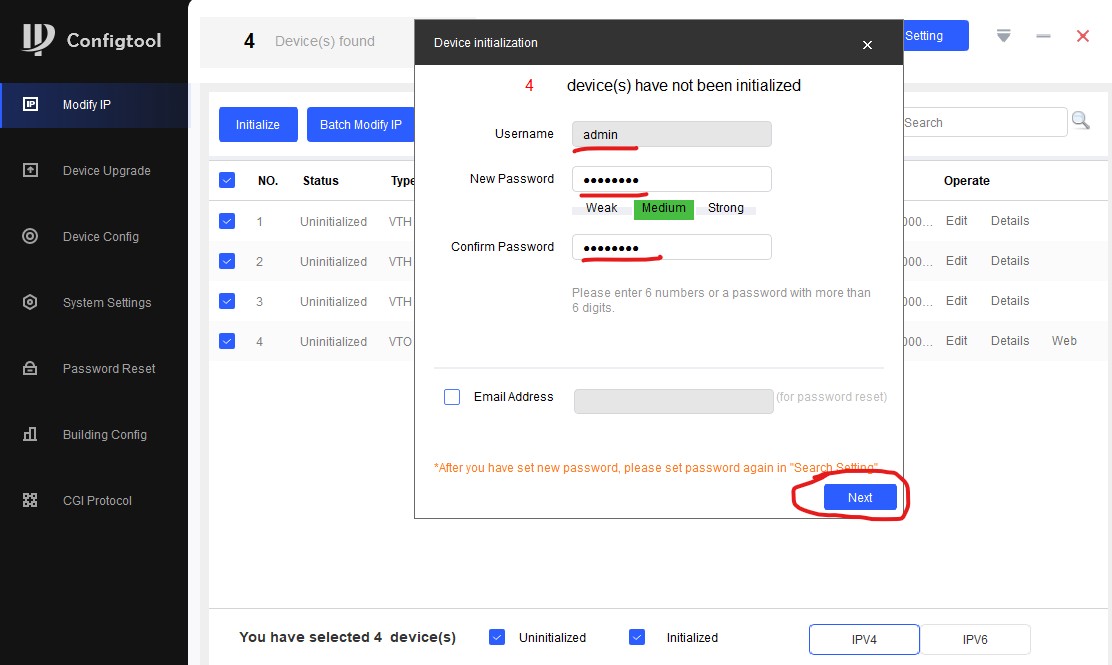 Вводим логин/пароль для устройств. Мы емейл не вбивали, а вообще его надо вбивать, чтобы потом было проще сбрасывать пароль, в случае если его потеряли. Также важно помнить: некоторые VTH в качестве пароля поддерживают только цифры, в нашем случае это не так, панельки мощные, у них много плюшек, включая подключение по Wi-Fi.