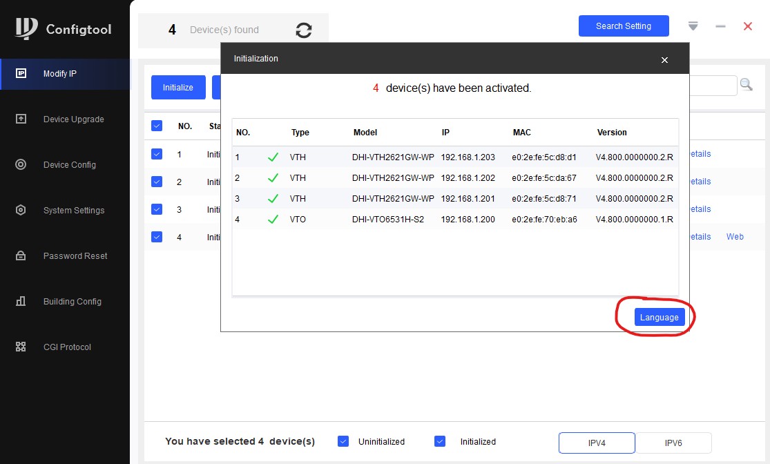 Здесь зеленая галочка означает успех. Нажимаем кнопку "Language", чтобы выбрать язык для устройств, в нашем случае это русский